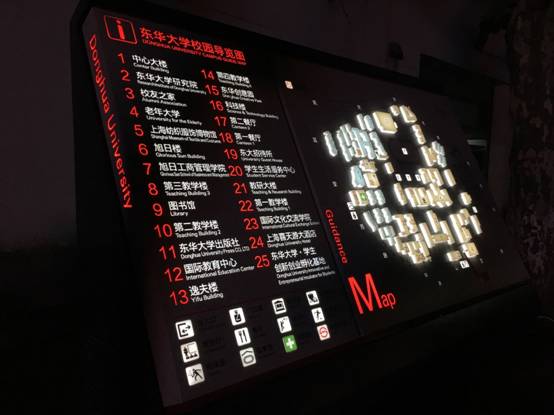 据介绍,延安路校区校园导视系统设计立足于该校区的环境和学科特色,以“融合、多元、时尚”为设计理念,将“崇德博学砺志尚实”校训融入设计,同时,还沿用松江校区校园导视系统所采用的“东华”经纬线装饰图形,通过石材本色与深灰色金属搭配,并以红色点缀装饰,构建了一套涵盖导览、导向、展示于一体的导视系统。