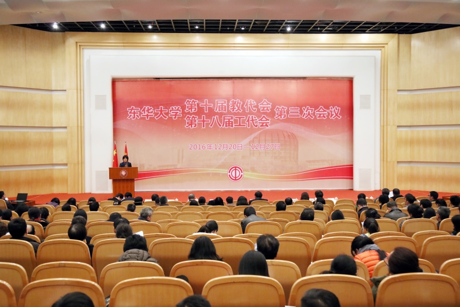 12月20日,我校第十届教代会暨第十八届工代会(以下简称“双代会”)第三次会议在松江校区开幕,会议听取和审议学校行政工作报告和2015年度财务状况报告。校长蒋昌俊,党委副书记、校工会主席刘淑慧,党委副书记崔运花,党委副书记兼纪委书记金海燕,副校长刘春红、邱高、李永智、卿凤翎、陈革等出席会议,本次双代会正式代表、列席代表等近200人与会。刘淑慧主持开幕式。
