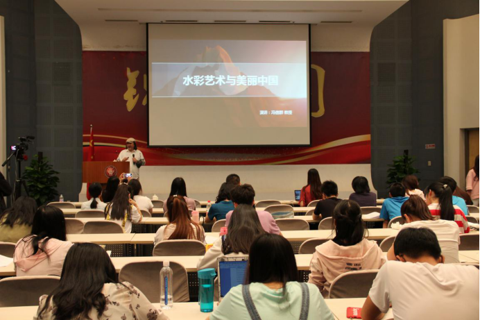 在讲座中,冯信群教授向同学们展示了自己创作的一幅幅水彩作品,其深厚功底及表现技法赢得了同学们的阵阵掌声。冯信群的讲授,让同学们经历了一次水与色彩的视觉游历,美丽中国在水彩艺术中精彩呈现。