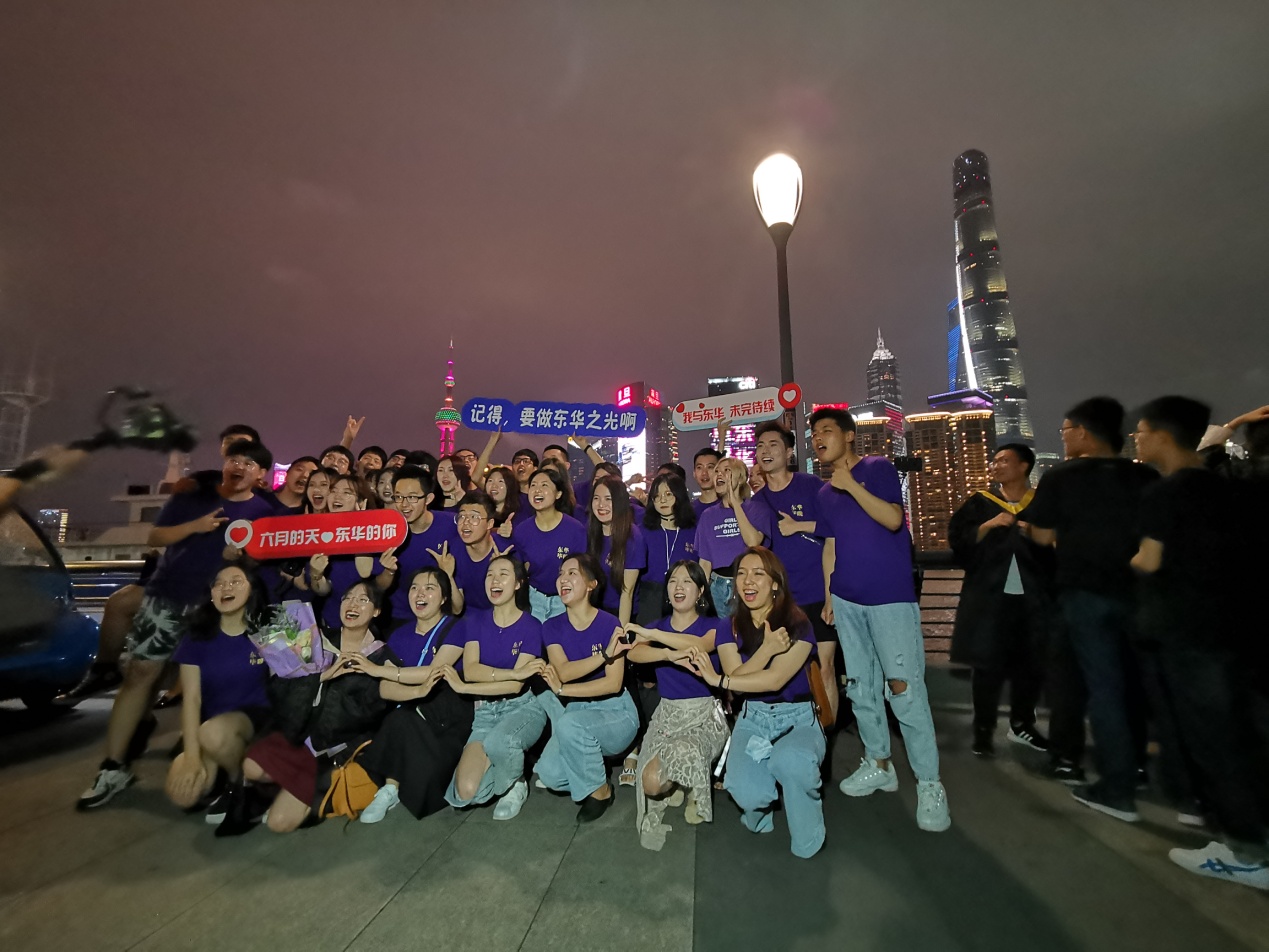 在线下活动中,2019届毕业晚会学生团队现场带来原创毕业歌曲《六月的天》,与“外滩之窗”大屏幕上的祝福语交相呼应。配合着线下手持创意KT板的文字,如“东华为你亮灯,你为东华闪耀”“记得,要做东华之光”“东华19有你,我们不说再见”“我与东华,未完待续”等,烘托出浓浓的毕业氛围。“文汇路”“人民北路”“延安西路”等学生熟悉的校园地标成为现场合影“神器”,“有趣、有料、有腔调”的蚕宝宝形象更是成为毕业生们现场争相留念的网红IP。