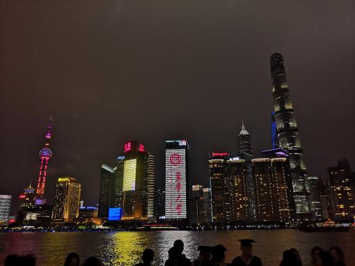 6月25日,我校2019届毕业典礼拉开大幕,当晚,上海地标建筑之一的“外滩之窗”再次为东华毕业学子点亮,大屏幕上轮番显示着为我校2019届学毕业广泛征集而来的毕业祝福语,“I❤DHU”“崇德博学,砺志尚实”“东华有面”“爱在上海,学在东华”“东华人,正青春”等逐一闪耀亮相外滩之滨,把毕业别离化作灯光里的嘱托。