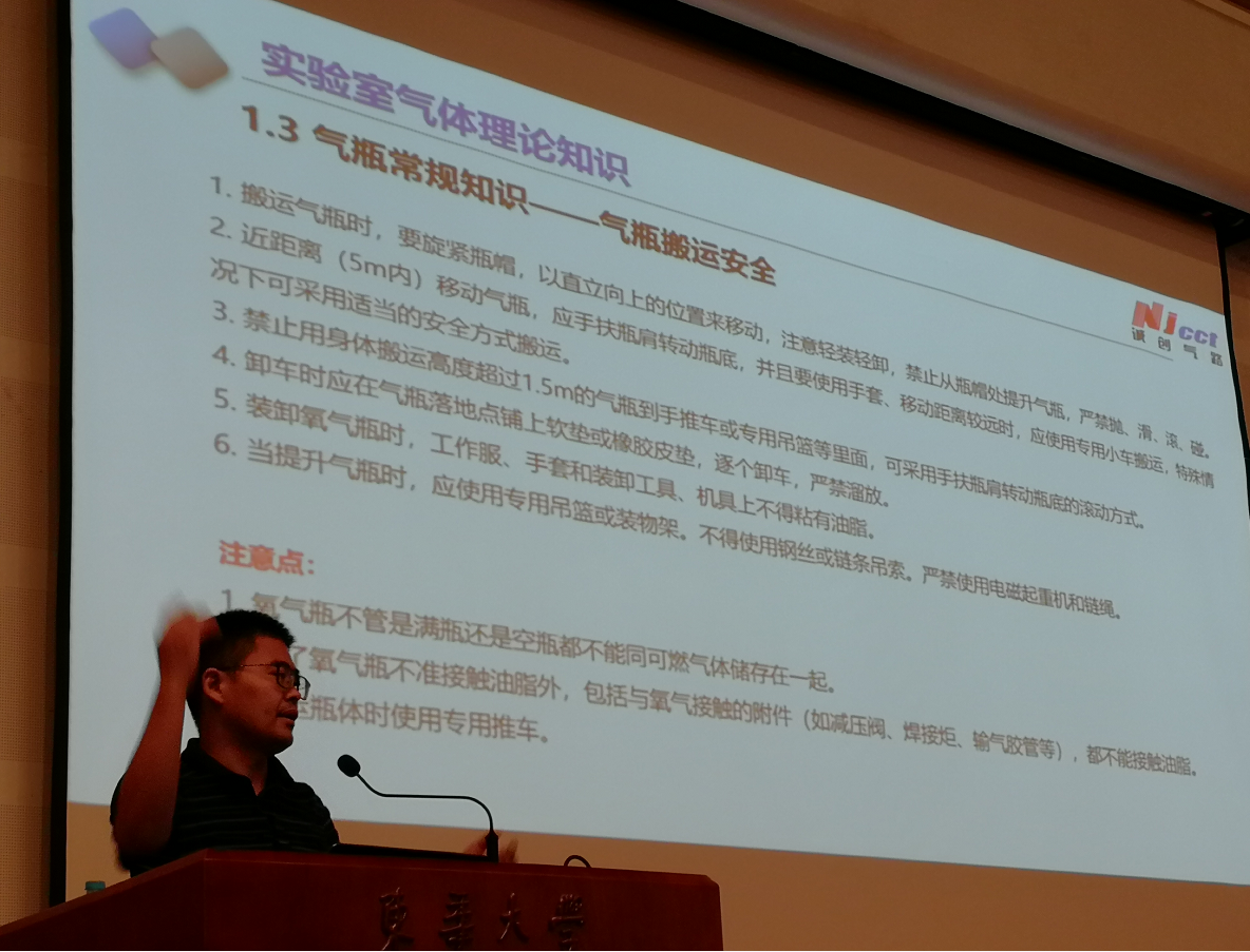学校邀请拥有十多年实验室集中供气行业经验、参编过《实验室建设与改造指南》的南京诚创科技系统有限公司陈建锋,从实验室气体理论知识、气路设计、部分高校实验室检查的问题及注意点、成功案例等方面,理论联系实际详细分析了当前高校实验室气体安全管理应关注要点,给出了保障实验室的安全供气的解决方案,并在现场为如何有效做好气体的安全使用和管理工作答疑解惑,参会师生收益颇丰。
