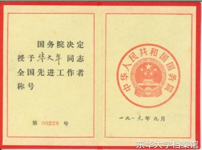 (1989年华大年教授获全国先进工作者证书、奖章)