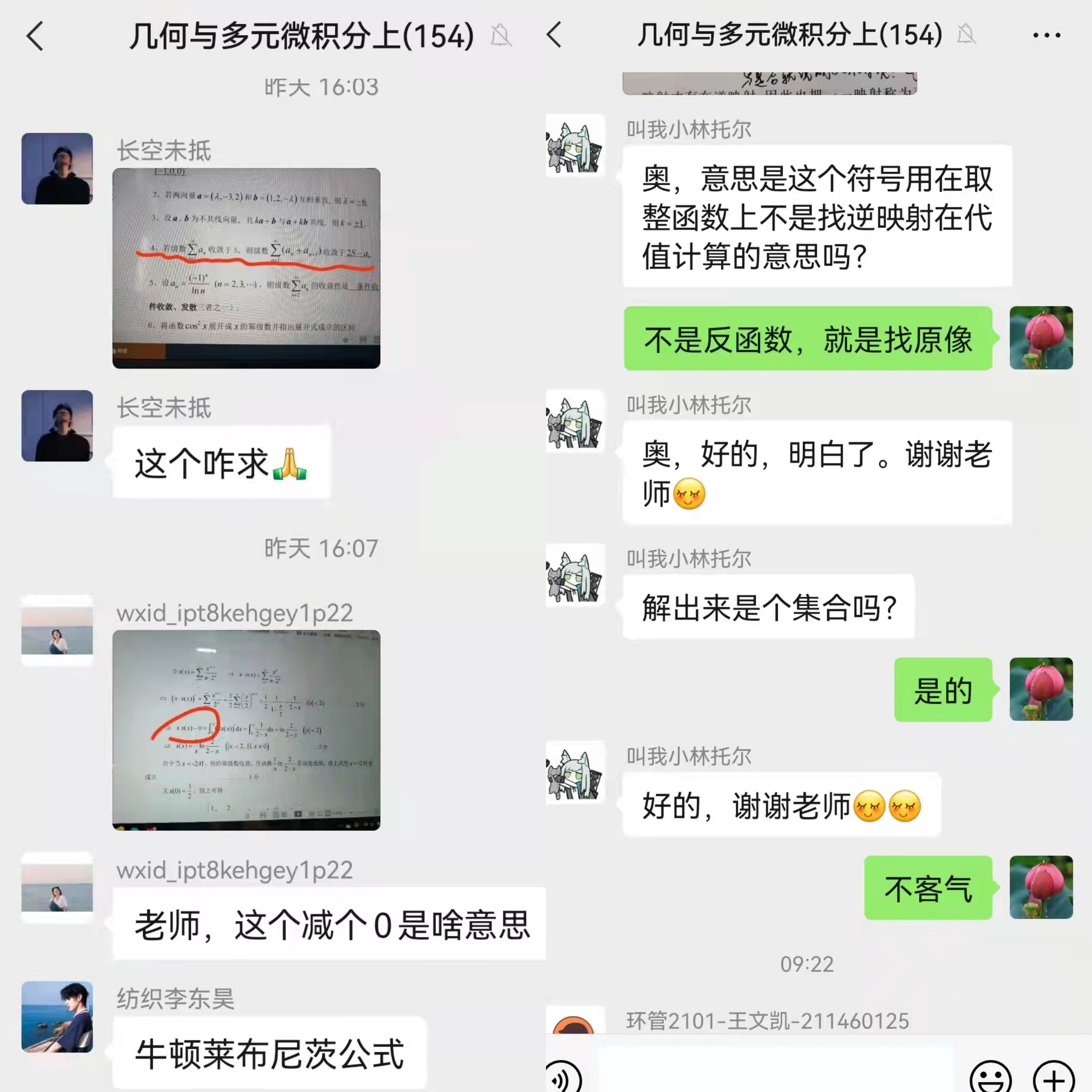 经过各门课程答疑群里的积极互动,不仅激发了同学们的学习热情,还拉近了师生距离。几何与多元微积分B(上)七班的同学们亲切地称呼任课老师谢峰为“老谢”,他们组建的学习群叫做“跟老谢学数学”。学生们在群里不仅向“老谢”请教问题,也彼此交流学习心得,在“茅塞顿开”后还不忘发个表情包来自我调侃。