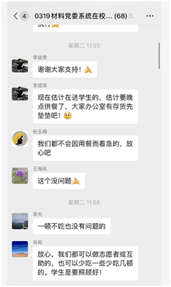 “面对严峻的疫情形势,我觉得心理有点忐忑的,但是看到李耀刚老师每天和我们吃住在一起,还在朋友圈持续发布暖心推文,我的心情瞬间明媚起来”,罗加贝同学是先进功能材料课题组的一名成员,每天坐等李老师朋友圈更新已经成为了他和组内同学的一种习惯。“疫情,不能限制我们的深入思考”“师生要彼此成就”,看到李老师分享的正能量,看到他在评论中为每一位老师和学生加油打气,内心在疫情之下的不安也就随之消失了。把学生的冷暖时刻挂在身上,这样的育人文化早已根植于全体教师心中,“我们可以少吃几顿,学生们要照顾好”,这些自然流露的心声,滋养着育人初心,带给人阵阵温暖与感动。