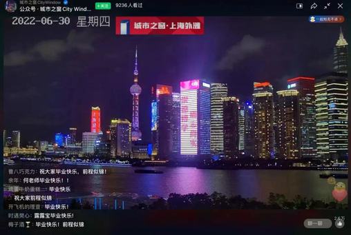 6月30日晚,外滩之滨,霓虹璀璨,一场主题为“东华与TA,想说的话”的外滩毕业季亮灯活动线上线下开启,分“东华与TA,想说的话”主题灯光秀展播、“从文汇路到延安西路的歌声”五年毕业歌展播以及毕业歌主创人员直播连线等三个环节展开。